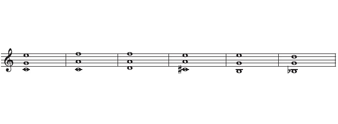 Bei den folgenden Beispielen kann die Terz (3) oder Quint (5) des Akkords verstimmt sein, der Grundton (1) ist nie verstimmt!