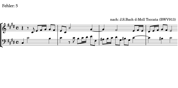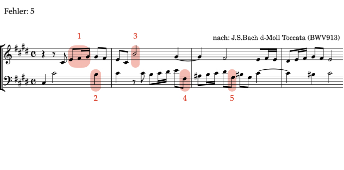 Alle Beispiele im Bereich Fehlerhören sind transponierte Varianten von Übungen, die an anderer Stelle in ear-training.org vorkommen. Aus diesem Grund steht das folgende Beispiel in einer anderen Tonart als im Original.