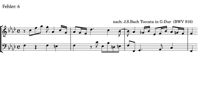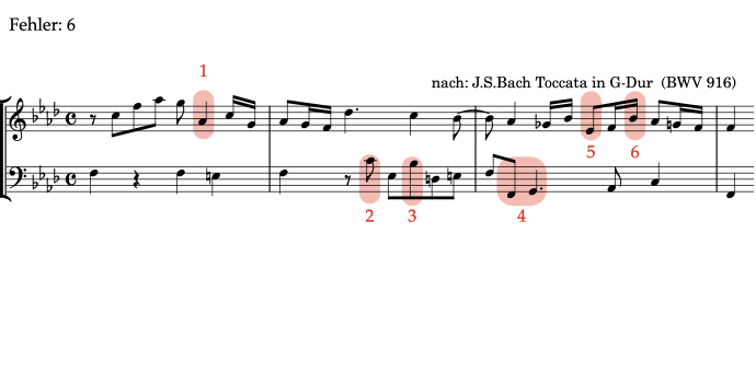 Alle Beispiele im Bereich Fehlerhören sind transponierte Varianten von Übungen, die an anderer Stelle in ear-training.org vorkommen. Aus diesem Grund steht das folgende Beispiel in einer anderen Tonart als im Original.
