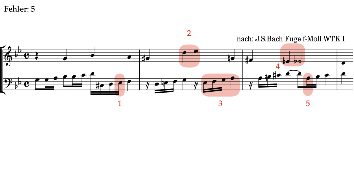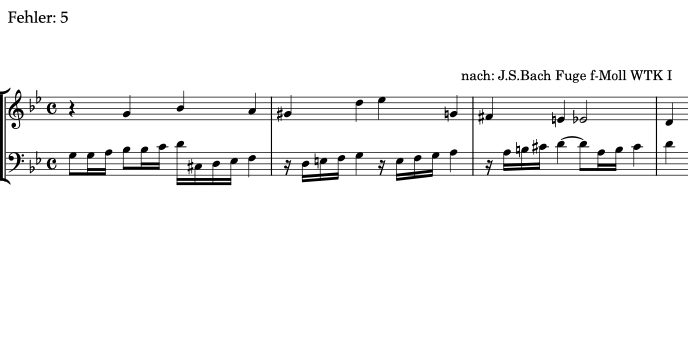 Alle Beispiele im Bereich Fehlerhören sind transponierte Varianten von Übungen, die an anderer Stelle in ear-training.org vorkommen. Aus diesem Grund steht das folgende Beispiel in einer anderen Tonart als im Original.