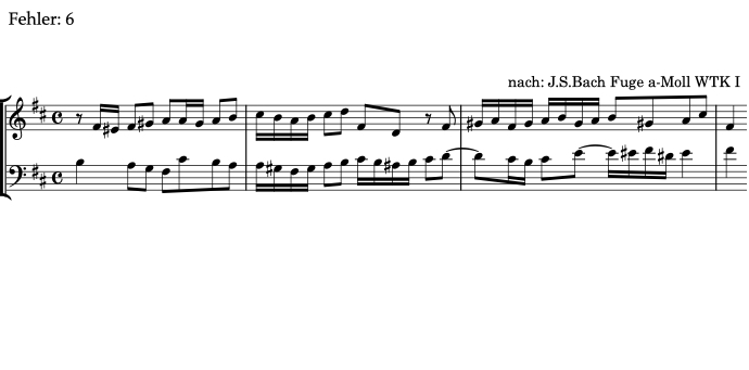Alle Beispiele im Bereich Fehlerhören sind transponierte Varianten von Übungen, die an anderer Stelle in ear-training.org vorkommen. Aus diesem Grund steht das folgende Beispiel in einer anderen Tonart als im Original.