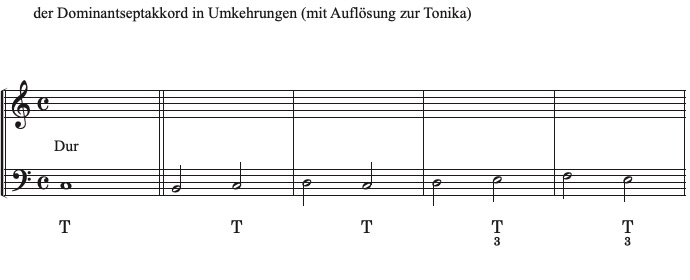 Die drei Umkehrungen des Dominantseptakkordes lassen sich im harmonischen Zusammenhang sehr gut voneinander unterscheiden, indem man auf die melodische Bewegung im Bass hin zur Tonika achtet: