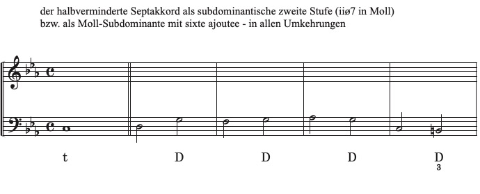 Ähnlich wie bei den Umkehrungen des Dominantseptakkordes (s. Kurs B 1.) kannst du dir die Umkehrungen des halbverminderten Septakkordes (als subdominantischen Klang) besonders gut merken, wenn du die melodische Bassbewegung beachtest. Bei den Dominantseptakkorden war es jeweils die Bewegung von der Dominante zur Tonika (D-T-Wendung). Hier ist es nun eine Bewegung von der Subdominante zur Dominante (S-D-Bewegung). Merke dir die vier möglichen Bewegungsmuster im Bass.