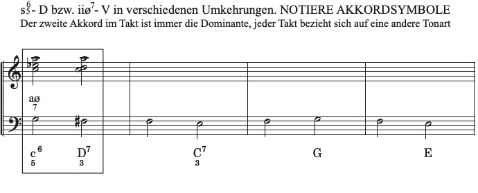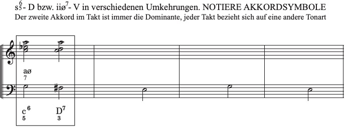 Bei dieser Übung erklingt in jedem Takt eine S-D-Wendung in einer andern Tonart. Du hast in den vorangehenden Übungen die verschiedenen S-D-Wendungen über den halbverminderten Septakkord kennengelernt und sollst nun versuchen, das Erlernte auf Akkordsymbole zu übertragen: Geh so vor, dass du zunächst den zweiten Akkord, also die Dominante bestimmst. Anschließend findest du "rückwärts" den Grundton der Subdominante bzw. der II. Stufe.