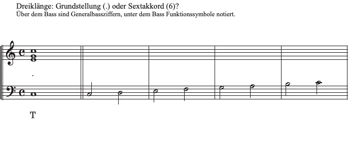 Hier wirst du im zweiten Takt einen speziellen Sextakkord kennenlernen, der in der Funktionstheorie einen komplizierten Namen hat: "verkürzter Dominantsepakkord mit Quinte im Bass". Tatsächlich hört sich der Akkord dominantisch an - und er löst sich wie eine Dominante zur Tonika auf -, aber zugleich ist dieser Akkord, wenn du ihn vom Bass aus denkst, einfach ein Sextakkord 1-3-6 (d-f-h). Es ist die Tritonusspannung f-h zwischen den beiden Oberstimmen, die ihm diesen dominantischen, spannungsgeladenen Ausdruck verleiht.