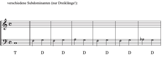 Wir üben zunächst die Unterscheidung drei verschiedener Subominanten als Dreiklänge: Die Grundstellung (z.B. f-a-c) sowie die beiden Sextakkorde S6 (f-a-d) und S mit Terz im Bass (a-c-f). Die Subdominante wird, wenn sie wie hier zur Dominante hinführt, auch Prädominante genannt (= vor der Dominante stehend). Präge dir diese S-D-Wendungen ein.