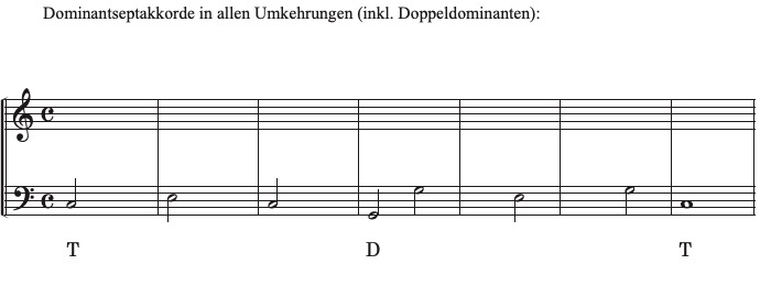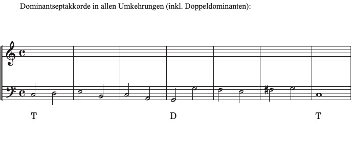 In diesem Beispiel erklingt zusätzlich zur Dominante die Doppeldominante in Umkehrungen. Grundsätzlich gilt die Merkregel für die melodische Bassbewegung (s. Übungen 1.1 und 1.2) für alle möglichen Zwischendominanten: Wenn man auf die Bassbewegung zum Zielakkord achtet, erkennt man die Dominant-Umkehrung.