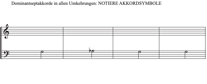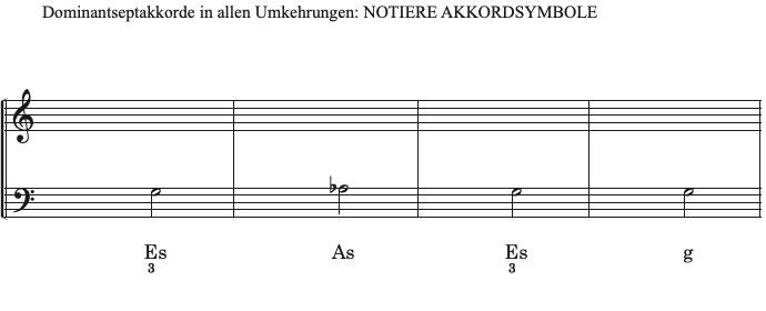 In jedem Takt erklingt eine Dominante, die sich zu einer Tonika auflöst, wobei jeder Takt in einer anderen Tonart steht. Übertrage nun in Akkordsymbole, indem du zunächst den Zielakkord (Tonika) bestimmst. Der Grundton der Dominante kannst du "rückwärts" ausrechnen (Dominant-Grundton = Quinte über dem Tonika-Grundton).