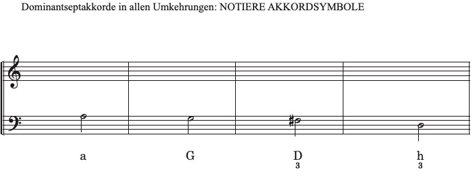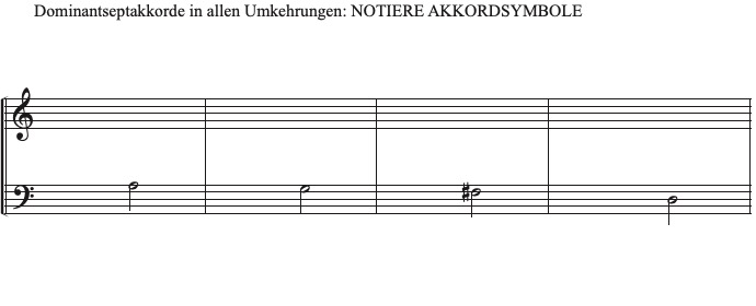In jedem Takt erklingt eine Dominante, die sich zu einer Tonika auflöst, wobei jeder Takt in einer anderen Tonart steht. Übertrage nun in Akkordsymbole, indem du zunächst den Zielakkord (Tonika) bestimmst. Der Grundton der Dominante kannst du "rückwärts" ausrechnen (Dominant-Grundton = Quinte über dem Tonika-Grundton).
