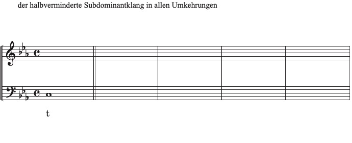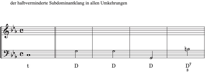 Ähnlich wie bei den Umkehrungen des Dominantseptakkordes (s. Kurs B 1.) kannst du dir die Umkehrungen des halbverminderten Septakkordes (als subdominantischen Klang) besonders gut merken, wenn du die melodische Bassbewegung beachtest. Bei den Dominantseptakkorden war es jeweils die Bewegung von der Dominante zur Tonika (D-T-Wendung). Hier ist es nun eine Bewegung von der Subdominante zur Dominante (S-D-Bewegung). Merke dir die vier möglichen Bewegungsmuster im Bass.