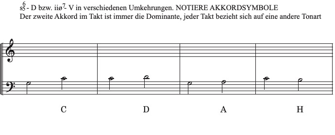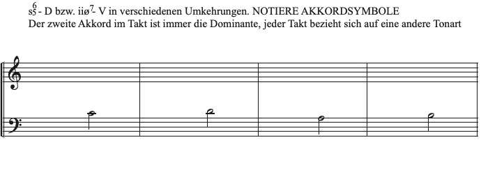 Wie bei 1.4: Bei dieser Übung erklingt in jedem Takt eine S-D-Wendung in einer andern Tonart. Du hast in den vorangehenden Übungen die verschiedenen S-D-Wendungen über den halbverminderten Septakkord kennengelernt und sollst nun versuchen, das Erlernte auf Akkordsymbole zu übertragen: Geh so vor, dass du zunächst den zweiten Akkord, also die Dominante bestimmst. Anschließend findest du "rückwärts" den Grundton der Subdominante bzw. der II. Stufe.